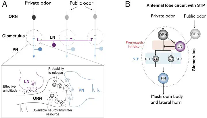 In Drosophila, olfactory information received by olfactory receptor neurons (ORNs) is first processed by an incoherent feed forward neural circuit in the antennal lobe (AL) that consists of ORNs (input), inhibitory local neurons (LNs), and projection neurons (PNs). This early olfactory information processing has two important characteristics. First, response of a PN to its cognate ORN is normalized by the overall activity of other ORNs, a phenomenon termed ``divisive normalization.’’ Second, PNs respond strongly to the onset of ORN activities, but they adapt to prolonged or continuously varying inputs. Despite the importance of these characteristics for learning and memory, their underlying mechanisms are not fully understood. Here, we develop a circuit model for describing the ORN-LN-PN dynamics by including key neuron-neuron interactions such as short-term plasticity (STP) and presynaptic inhibition (PI). By fitting our model to experimental data quantitatively, we show that a strong STP balanced between short-term facilitation (STF) and short-term depression (STD) is responsible for the observed nonlinear divisive normalization in Drosophila. Our circuit model suggests that either STP or PI alone can lead to adaptive response. However, by comparing our model results with experimental data, we find that both STP and PI work together to achieve a strong and robust adaptive response. Our model not only helps reveal the mechanisms underlying two main characteristics of the early olfactory process, it can also be used to predict PN responses to arbitrary time-dependent signals and to infer microscopic properties of the circuit (such as the strengths of STF and STD) from the measured input-output relation. Our circuit model may be useful for understanding the role of STP in other sensory systems.