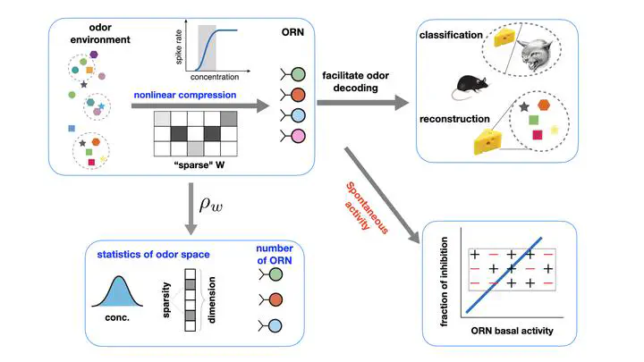 There are numerous different odorant molecules in nature but only a relatively small number of olfactory receptor neurons (ORNs) in brains. This ``compressed sensing’’ challenge is compounded by the constraint that ORNs are nonlinear sensors with a finite dynamic range. Here, we investigate possible optimal olfactory coding strategies by maximizing mutual information between odor mixtures and ORNs’ responses with respect to the bipartite odor-receptor interaction network (ORIN) characterized by sensitivities between all odorant–ORN pairs. For ORNs without spontaneous (basal) activity, we find that the optimal ORIN is sparse—a finite fraction of sensitives are zero, and the nonzero sensitivities follow a broad distribution that depends on the odor statistics. We show analytically that sparsity in the optimal ORIN originates from a trade-off between the broad tuning of ORNs and possible interference. Furthermore, we show that the optimal ORIN enhances performances of downstream learning tasks (reconstruction and classification). For ORNs with a finite basal activity, we find that having inhibitory odor–receptor interactions increases the coding capacity and the fraction of inhibitory interactions increases with the ORN basal activity. We argue that basal activities in sensory receptors in different organisms are due to the trade-off between the increase in coding capacity and the cost of maintaining the spontaneous basal activity. Our theoretical findings are consistent with existing experiments and predictions are made to further test our theory. The optimal coding model provides a unifying framework to understand the peripheral olfactory systems across different organisms.