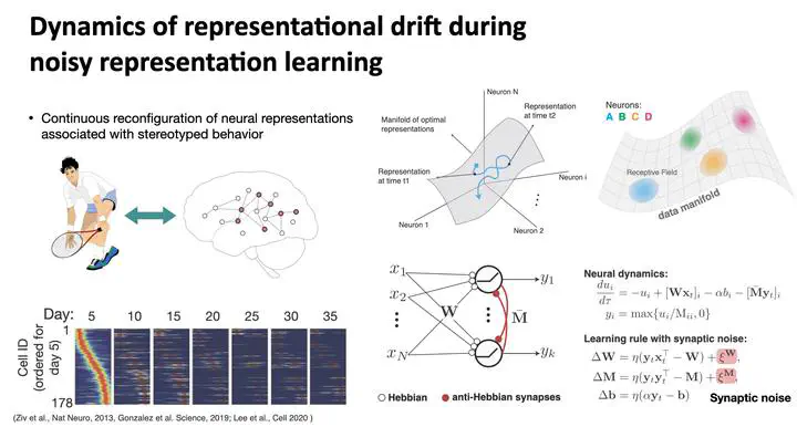 Recent experiments have revealed that neural population codes in many brain areas continuously change even when animals have fully learned and stably perform their tasks. This representational `drift’naturally leads to questions about its causes, dynamics and functions. Here we explore the hypothesis that neural representations optimize a representational objective with a degenerate solution space, and noisy synaptic updates drive the network to explore this (near-)optimal space causing representational drift. We illustrate this idea and explore its consequences in simple, biologically plausible Hebbian/anti-Hebbian network models of representation learning. We find that the drifting receptive fields of individual neurons can be characterized by a coordinated random walk, with effective diffusion constants depending on various parameters such as learning rate, noise amplitude and input statistics. Despite such drift, the representational similarity of population codes is stable over time. Our model recapitulates experimental observations in the hippocampus and posterior parietal cortex and makes testable predictions that can be probed in future experiments.
